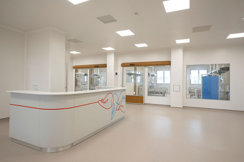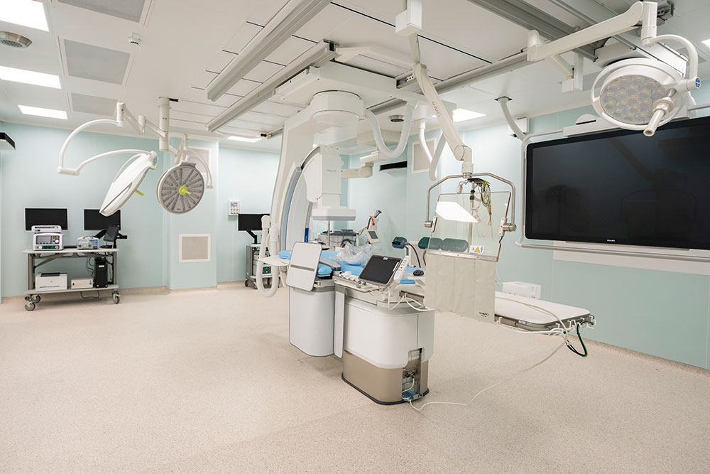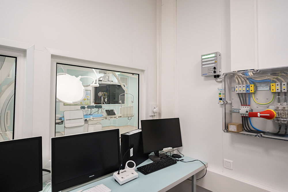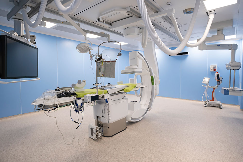 A sufficiently spacious resuscitation unit located on the same floor as the operating suite, 3 operating rooms equipped with ceiling-mounted angiographic systems from Philips and cantilevered operating tables. 1 operating room for open-heart surgery with a laminar flow ceiling.